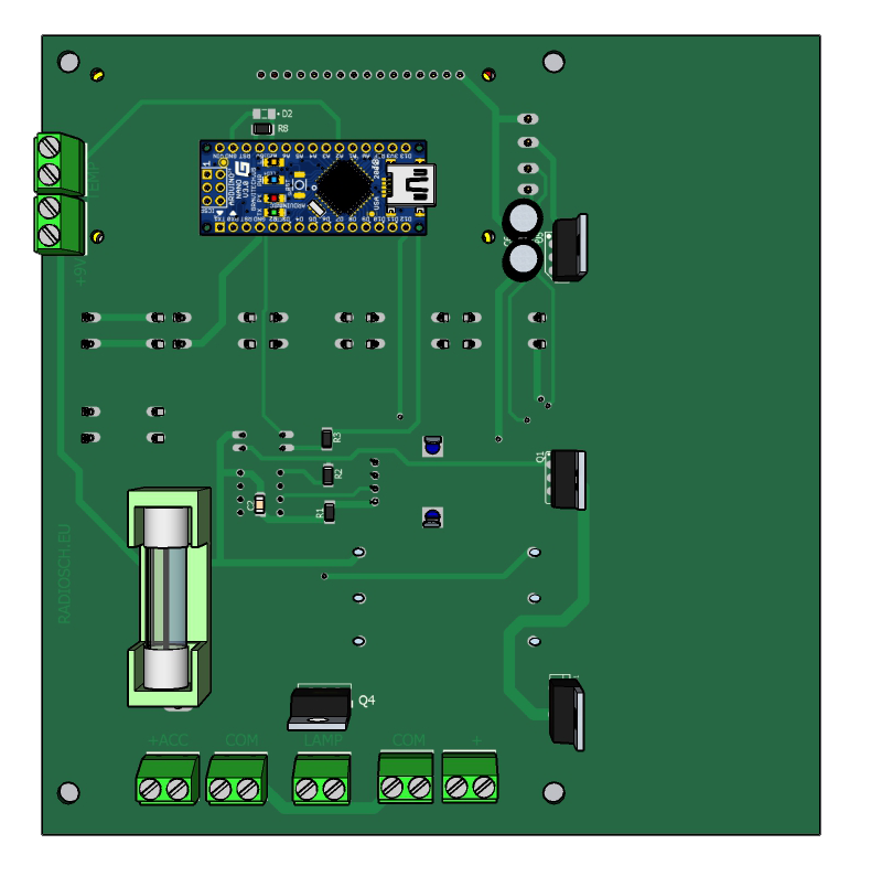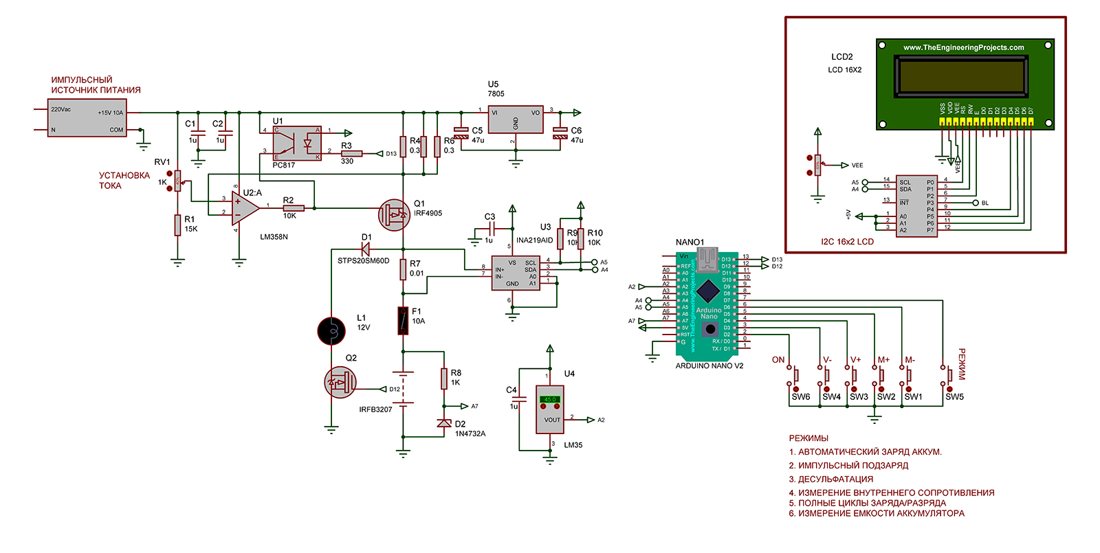Устройство позволяет проводить автоматический заряд автомобильных аккумуляторов током до 10А, импульсный подзаряд, десульфатацию аккумулятора, измерение внутреннего сопротивления и ёмкости, проводить полный цикл заряда/разряда аккумулятора. Схема приведена ниже