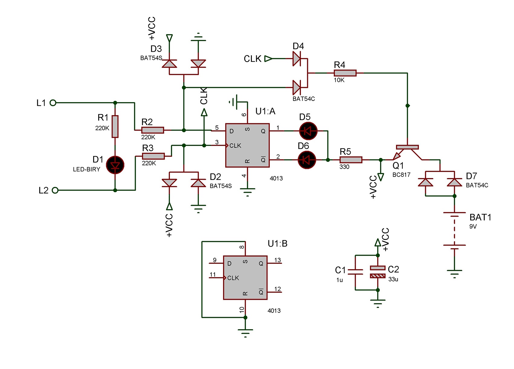 Провод А определителя подключается к любой фазе, которая условно становится фазой А. Далее необходимо определить очередность фазы В относительно условной фазы А. Cхема определителя реализована на D-триггере U1. Преимущество таккой схемы в том, что светодиод индикации очередности фаз горит постоянно. Когда импульсы сформированные по фазе В поступают на вход D триггера U1А, а импульсы по фазе В на вход CLК, то фазы чередуются правильно и на прямом выходе триггера U1 включается лог.1, на инверсном выходе - лог.0. При этом включается зеленый светодиод D6. В случае, когда импульсы на вход CLК поступают раньше импульсов на вход D, фазы подключены неправильно, на прямом выходе триггера включается лог.0 , на инверсном - лог.1 и включается красный светодиод D5. Питание от аккумулятора DAWEIKALA 9В 6800мА/ч