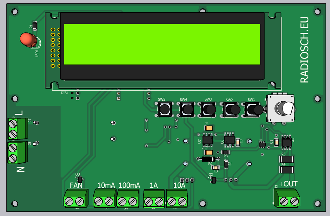 УЭлектронная нагрузка состоит из операционного усилителя U6, мощного транзистора Q1 и декадных резистивных делителей R6,R10,R13 R7,R11,R14 и R8,R12,R15. Установка тока нагрузки осуществляется с помощью энкодера EN1 и ЦАП U2, выходное напряжение которого поступает на + вход операционного усилителя U6. Значение тока от 1 до 10А считывается АЦП U1, подключенного к Ардуино по I2C. Значения токов от 100мА до 1А и от 1мА до 100мА считываются с помощью 16-ти разрядных АЦП U3,U4 также подключенных к Ардуино по I2C. Информация отображается на 2-х строчном 20-ти символьном LCD дисплее подключенном к Ардуино по I2C. Микросхема U7 формирует отрицательное напряжение питания операционного усилителя U6. Питание устройства от AC DC конвертера 5В 1А.