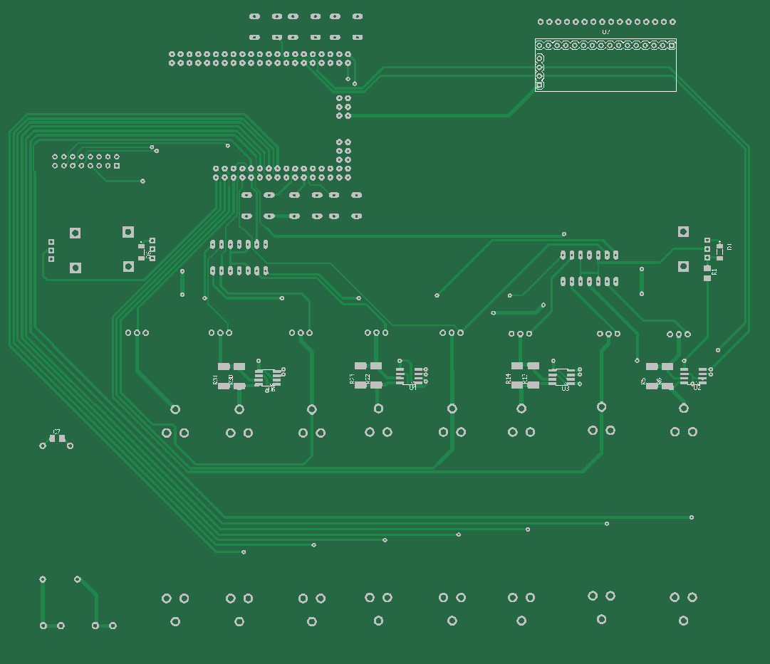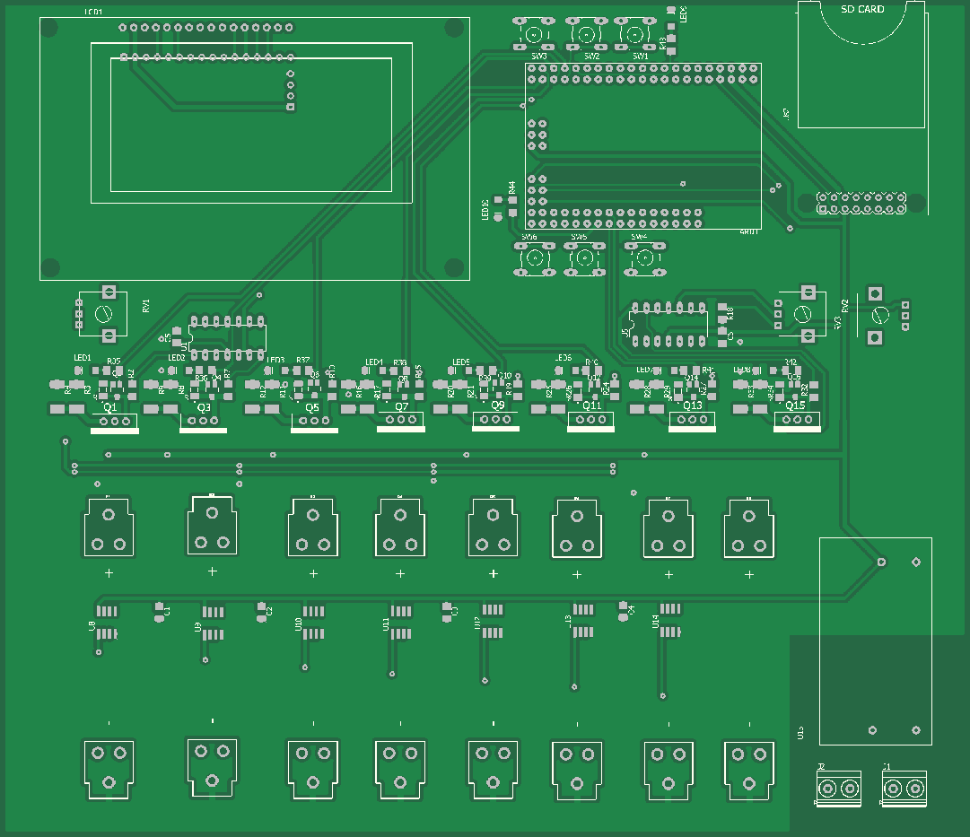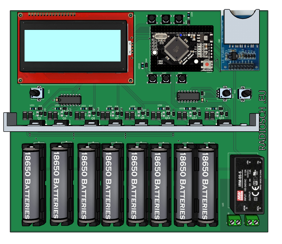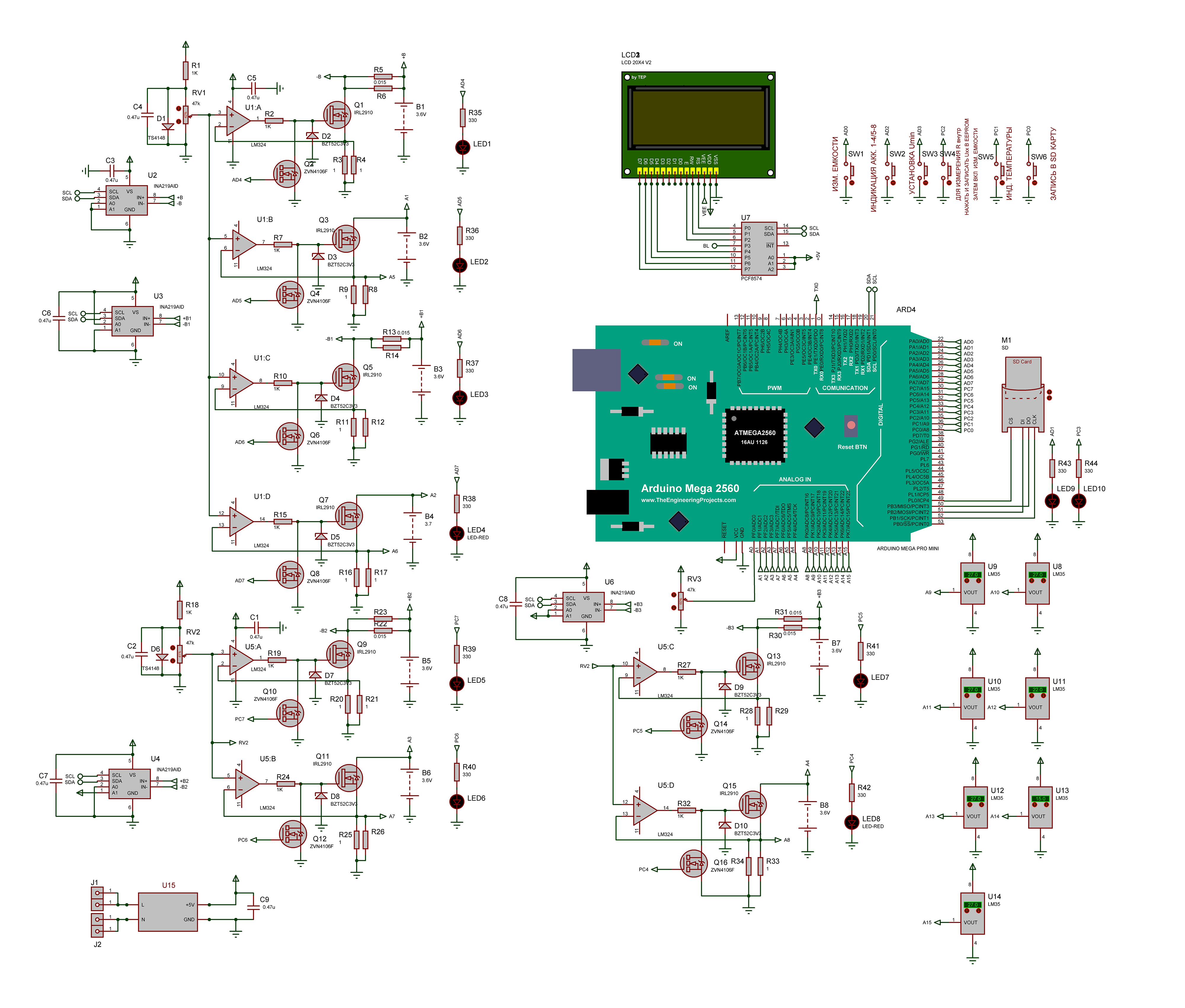 Схема состоит из 8-ми электронных нагрузок, выполненных на операционных усилителях U1, U5, транзисторах Q1 - Q16. Транзисторы Q2,Q4,Q6,Q8,Q10, Q12,Q14,Q16 отключают нагрузки при окончании разряда аккумуляторов. Сердцем устройства является Ардуино Мега Про. Индикация выполнена на 4-х строчном 20-ти символьном LCD дисплее, подключенном к Ардуино по I2C. Измерения напряжений и токов разряда аккумуляторов В1,В3,В5,В7 производится с помощью датчиков U2,U3,U4,U6 подключенных к Ардуино по I2C. Для измерения напряжений аккумуляторов В2,В4,В6,В8 их выходы подключаются к аналоговым входам А1,А2,А3,А4 Ардуино. Токи разряда этих аккумуляторов измеряются путём измерения падений напряжений на резисторах R9 R8, R16 R17, R25 R26 и R34 R33, подключенных к аналоговым входам Ардуино А5,А6,А7,А8 соответственно.Подстроечным резистором RV1 устанавливается ток разряда аккумуляторов В1 - В4, подстроечным резистором RV2 устанавливается ток разряда В5 - В8. Подстроечным резистором RV3 устанавливается минимальное напряжение аккумулятора, при достижении которого процесс разряда и измерения емкости прекращаются. Температуры аккумуляторов измеряются температурными датчиками U8 - U14 типа LM35. Питание от AC DC конвертора 5В 1А.