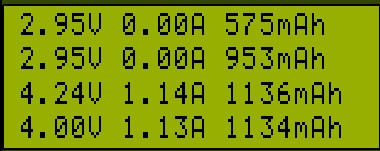 На рис. слева 1-й столбец - напряжения аккуммуляторов В1 -В4, 2-й столбец - токи разряда, 3-й столбец ёмкости аккумуляторов. На рис. справа измерения ёмкостей аккумуляторов В1, В2 завершены. Для просмотра состояния аккумуляторов В4 - В8 нажать кнопку SW2, при этом включится светодиод LED10.
