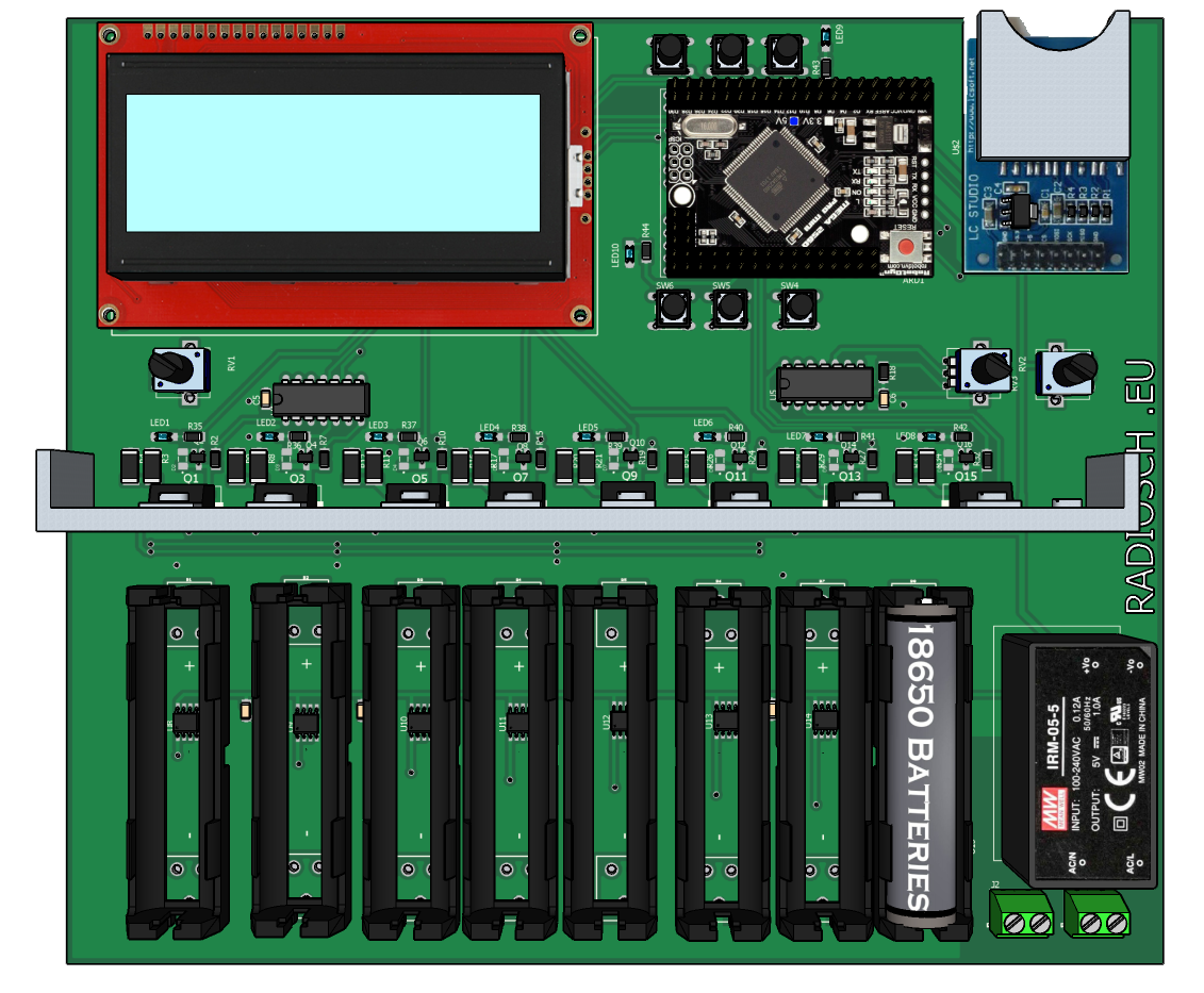 Устройство позволяет измерять емкости и внутренние сопротивления одновременно 8-ми Li-Ion аккумуляторов 18650. В процессе измерения ёмкости через каждые 10 минут значения текущей емкости, напряжения, тока разряда и текущая температура аккумулятора записываются в SD карту. Схема устройства приведена ниже.