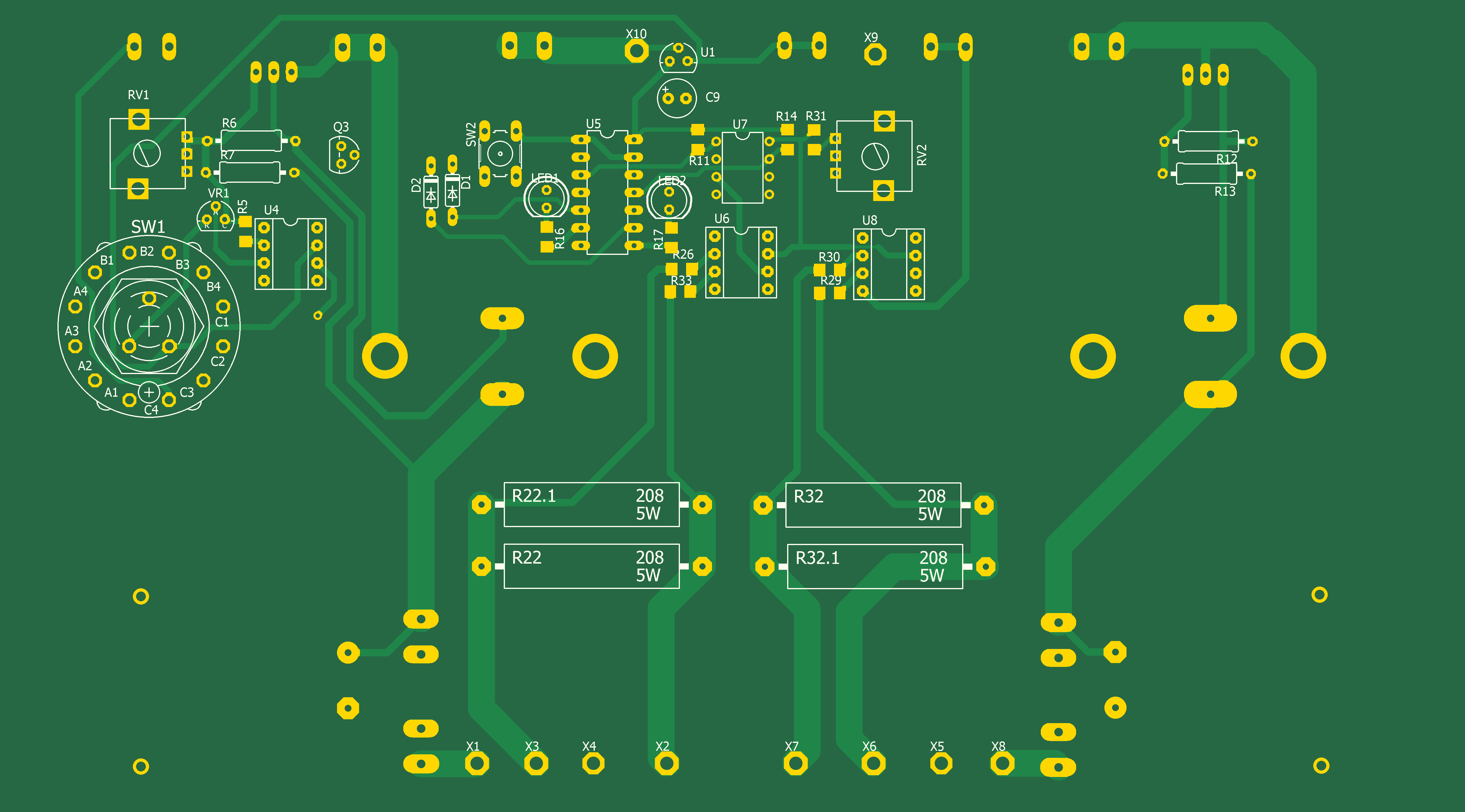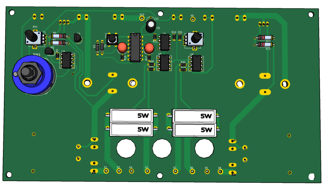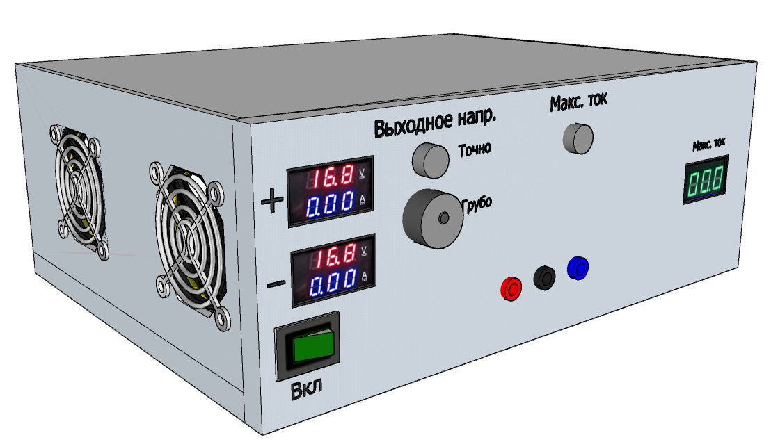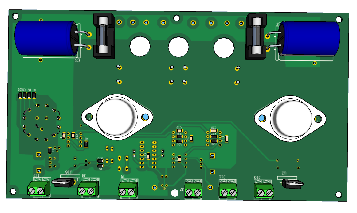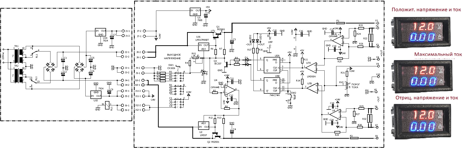 Источник положительного напряжения выполнен на миросхеме U16 типа LM317. Для достижения выходного тока 8А к ней подключен транзистор Дарлингтона MJ3001. Источник отрицательного напряжения выполнен на миросхеме U2 типа LM337. Для достижения выходного тока 8А к ней подключен транзистор Дарлингтона MJ2501. Оба источника имеют общий источник опорного напряжения на регулируемом стабилитроне VR1 TL431 и общий регулятор выходного напряжения RV1. Таким образом устанавливается одинаковое значение как положительного так и отрицательного напряжения от±3В до ±24В.