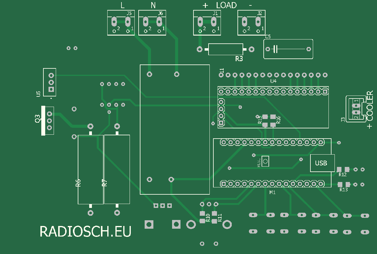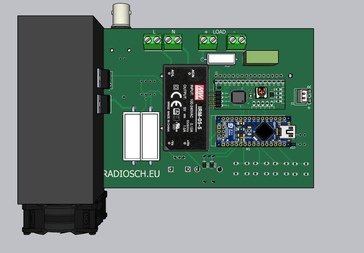 В устройстве имеется защита мощного транзистора Q3 от перегрева с помощью температурного датчика U4, установленного на радиаторе рядом с транзистором Q3. При нагреве транзистора выше 110°C на выходе D13 появляется лог.1, транзистор Q4 открывается, включается вентилятор и нагрузка отключается. При охлаждении Q3 ниже 110°C вентилятор отключается и нагрузка включается.