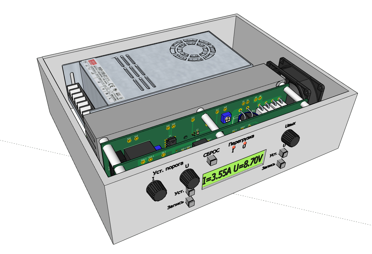 При превышении любого установленного порога на выходе PD4 микропроцессора появляется лог.1, открывается полевой транзистор Q1 и выходное напряжение блока питания отключается. При перегрузке по току загорается светодиод LED1, при перегрузке по напряжению - светодиод LED2. Для отображения значений выходного тока, напряжения и порогов применен однострочный 16-ти символьный LCD дисплей
