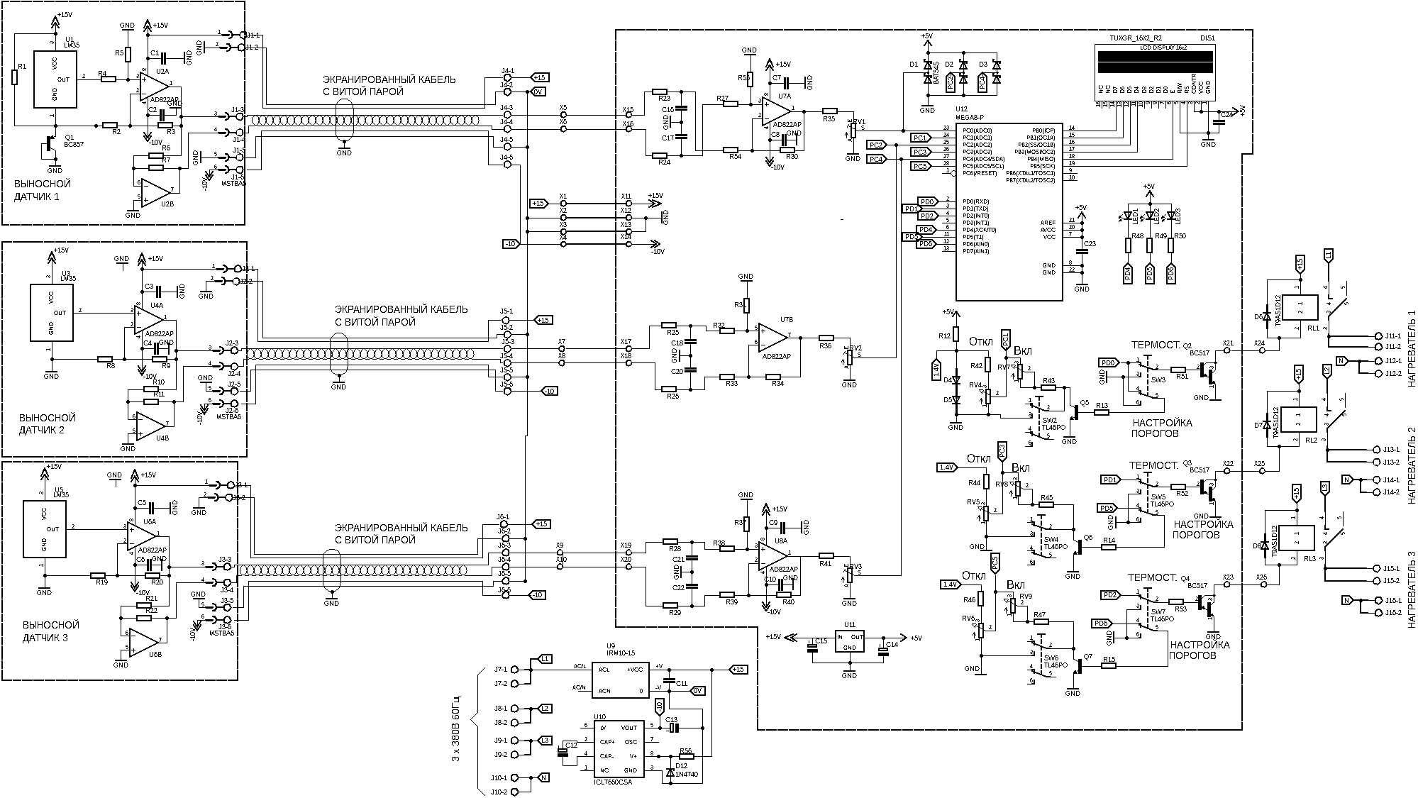 Датчики температур выполнены восхемах U1, U3, U5. Для работы при отрицательных температурах датчик U1 включен с подпоркой на транзисторе Q1. Напряжения датчиков усиливаются опервционными усилителями U2, U4, U6. Выносные датчики подключены к термостату с помощью экранированныж кабелей с витой парой. Сигнальные выходы дифференциальные. Это позволяет обеспечить длину кабеля до 10м.Эти сигналы усиливаются дифференциальными усилителями U7, U8 и поступают на входы АЦП РС0,РС2 и РС4 микропроцессора. Когда напряжения на этих входах меньше пороговых, установленных на входах РС1,РС3,ЛС5, на выходах PD0, PD1, PD2 лог. 1, транзисторы Q2,Q3,Q4 открыты, реле RL1, RL2, RL3 и нагреватели включены.