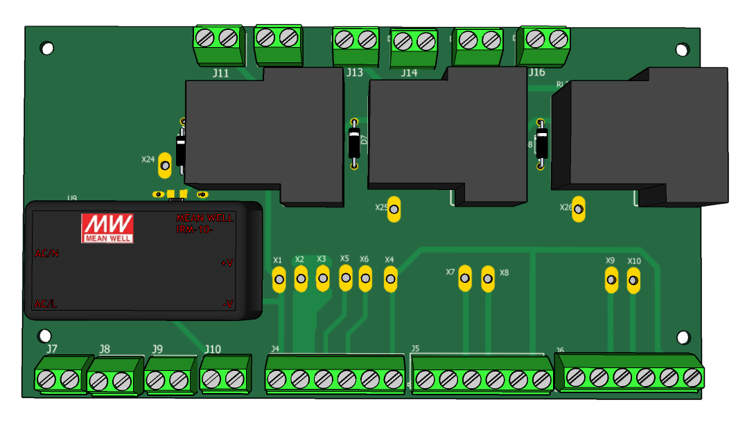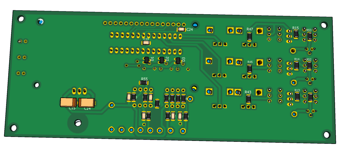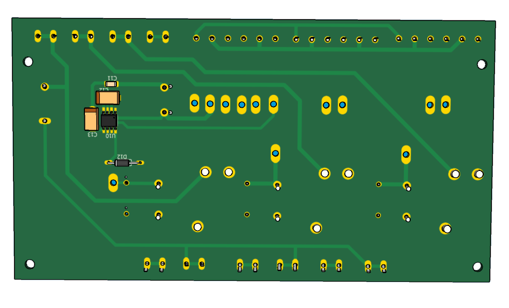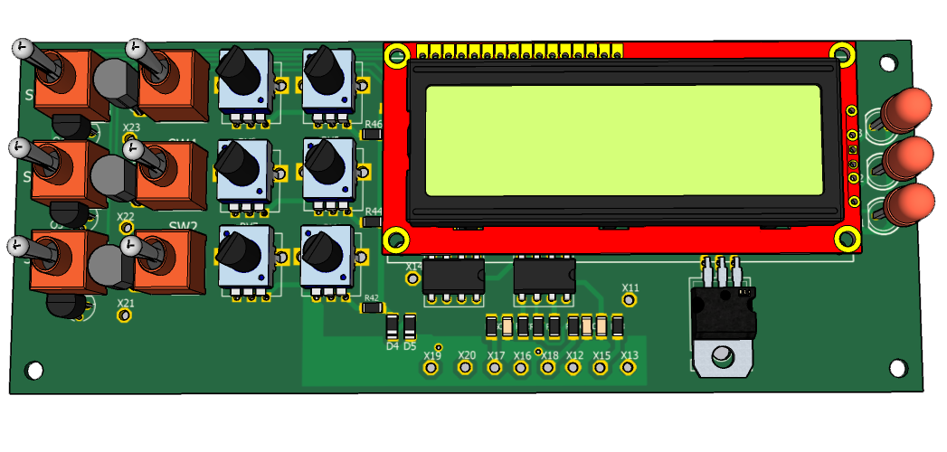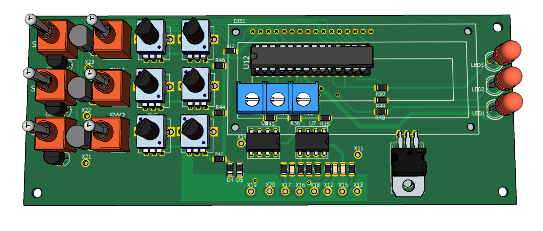 Для установки порогов включения и выключения необходимо переключатель SW3 переключить в нижнее по схеме положение и резистором RV4 установить необходимый порог отключения, затем переключатель SW2 переключить в нижнее по схеме положение и резистором RV7 установить необходимый порог включения обогревателя. После этого оба переключателя переключить в верхнее положение. Пороги в других каналах устанавливаются аналогично.