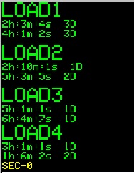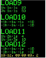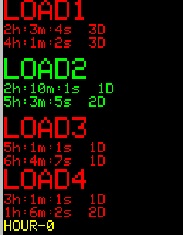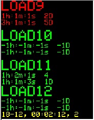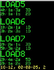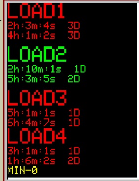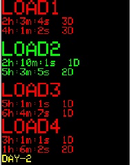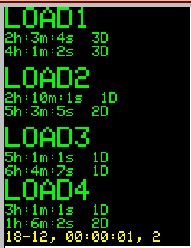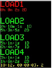 Состояние остальных дисплеев можно просмотреть нажимая DISP+. Под каждой надписью LOAD показано установленное время включения и выключенмия нагрузки. В нижней строке желтым цветом указаны текущий год, месяц, часы, минуты, секунды и день недели. Включенная нагрузка указывается красным цветом, как на картинке справа.