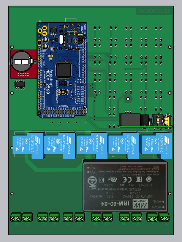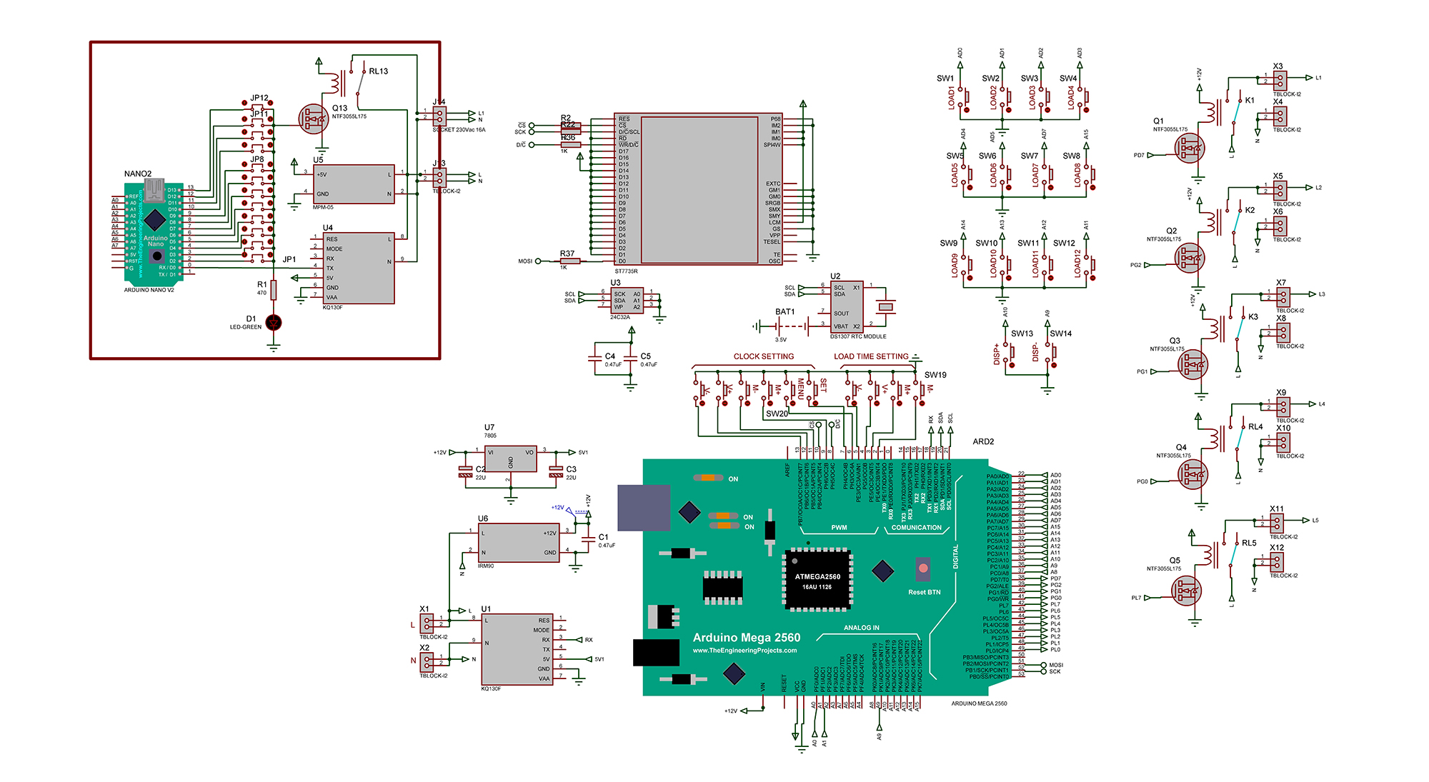 Для простоты на схеме приведена панель управления и один модуль управления. Всего м.б. до 12-ти модулей. Номер нагрузки устанавливается джампером. Панель управления выполена на Ардуино Мега. Для регистрации времени включения и выключения имеются встроенные часы на энергонезависимом RTC модуле U2 типа DS1307 с встроенным аккумулятором. Установленное для каждой нагрузки время включения и выключения в днях недели, часах, минутах, секундах записывается в энергонезависимую память U3 типа 24C32.