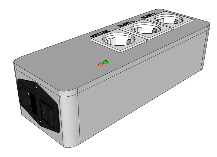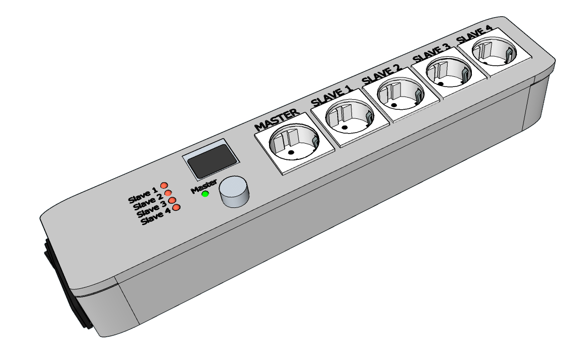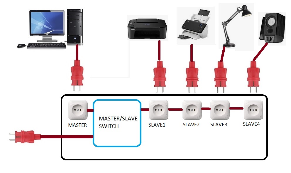 Переключатель Master / Slave служит для автоматического включения ведомой нагрузки от включения ведущей. Встроенный датчик контролирует ток, потребляемый ведущим блоком, и когда ток превышает предварительно определенный уровень, ведомые выходы автоматически включаются. Устройство можно применить для в настольных ПК. Когда ПК включен, все периферийные устройства (например монитор, принтер, сканер, аудиоколонки и так далее) тоже включаются автоматически.