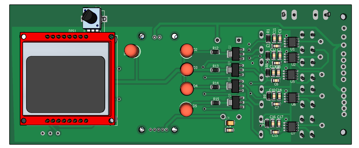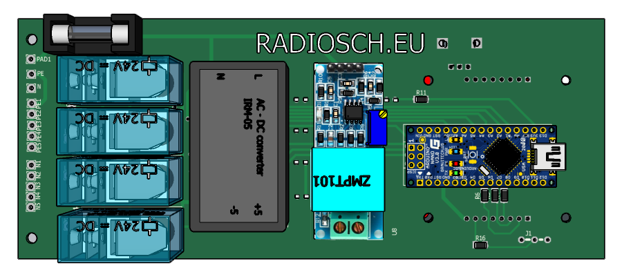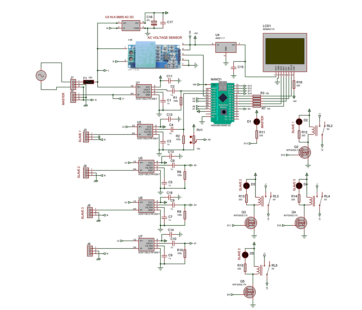 Датчик тока U1 приенен для измерения тока через ведущую нагрузку. Сигнал с его выхода поступает на аналоговый вход А0 Ардуино Нано. Датчики тока U2, U5, U6, U7 измеряют токи ведомых нагрузок SLAVE 1 - SLAVE 4. Сигналы с выходов поступают соответственно на аналоговые входы А1, А3, А4, А5 Ардуино. При превышении тока в датчике U1 порога, установленного в скетче, через заданное в скетче время на выходах D12, D11, D10, D9 поочерёдно включаются лог. 1, открываются соответственно транзисторы Q2, Q3, Q4, Q5. Эти транзисторы включают реле RL2 - RL5, которые своими контактами включают ведомые нагрузки SLAVE1 - SLAVE4. Для питания схемы применен AC DC конвертор IRM05 5V 1A. В качестве индикаторп применен модуль дисплея NOKIA 5110.