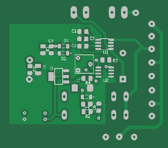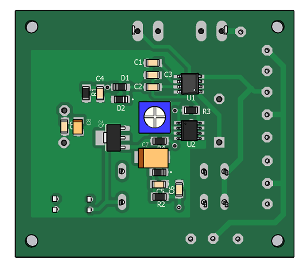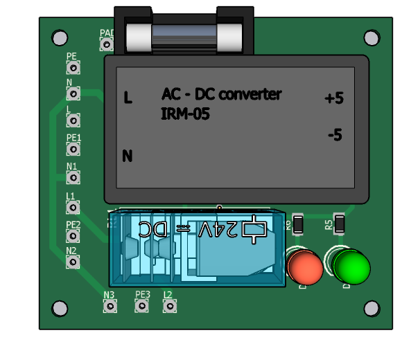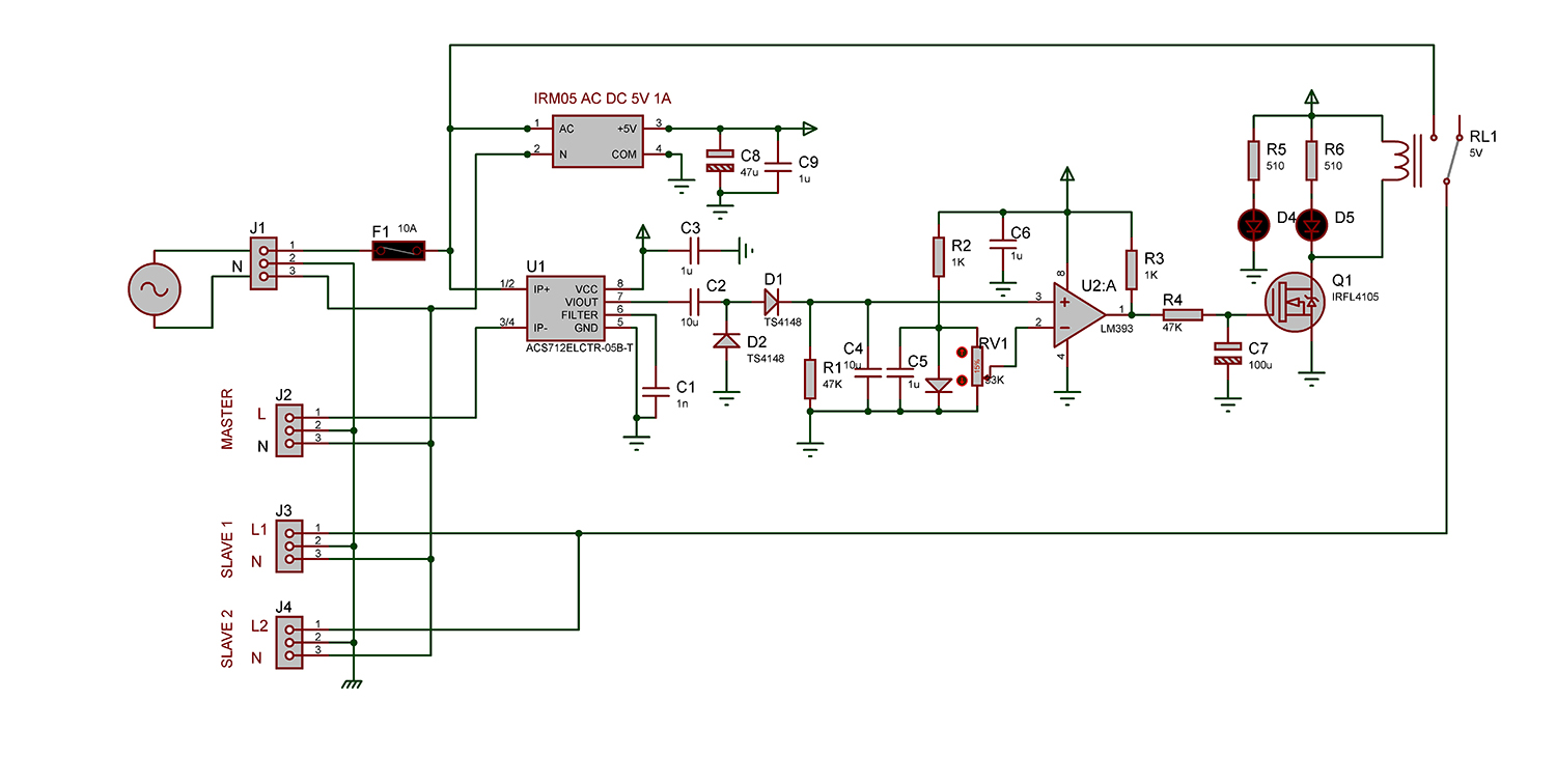 При включении нагрузки MASTER на выходе датчика тока U1 появляется переменное напряжение 50Гц. Это напряжение выпрямляется диодами D1,D2 и поступает на компаратор U2. Если оно превышает опорное напряжение, установленное триммером RV1, на выходе компаратора включается +5В, через время, заданное R4, C7 транзистор Q1 открывается и включается реле RL1, которое своими контактами включает ведомые нагрузки SALAVE 1, SLAVE 2. Для питания схемы применен AC DC конвертор IRM05 5V 1A.