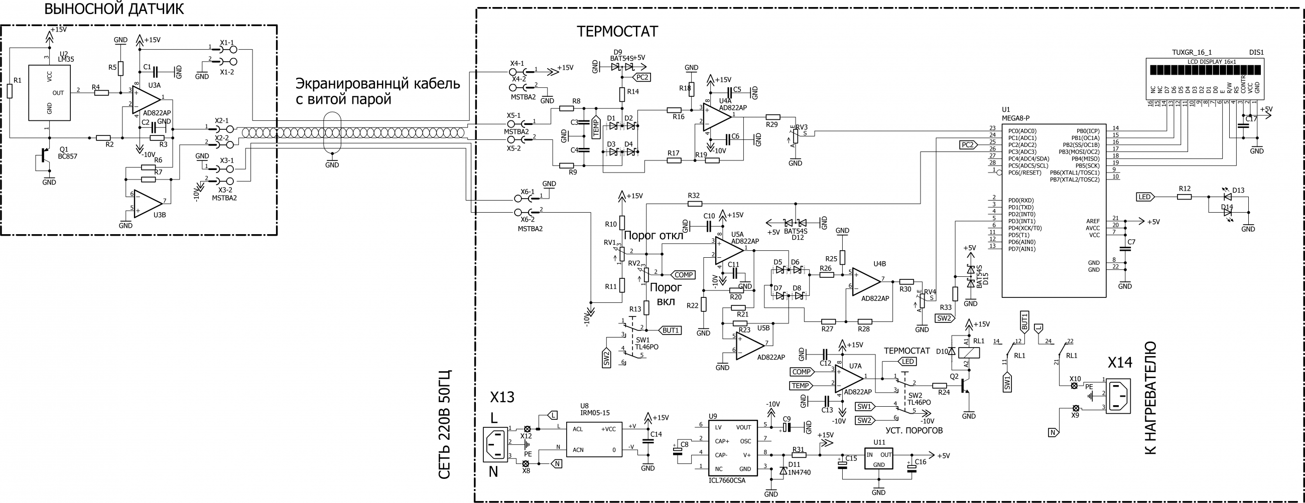 Датчик температуры LM35 включен с подпоркой на транзисторе Q1. При температуре 0 °C на выходе усилителя U3 напряжение 0В. При температуре -40 °C на выходе -4В, при +120 °C напряжение +12В. Выносная плата подключается к термостату с помощью экранированного кабеля с витой парой. Это позволяет подавлять синфазные помехи. Длина кабеля до 8-ми метров. Схема работает аналогично предыдущей, с той разнице, что для индикации отрицательных температур применяются диодный мпст на диодах Шоттки D1 - D4 , для индикации порогов вулючения и выелючения нагревателя - диодный мпст на диодах Шоттки D5 - D8. Питание с помощью AC DC конвертера IRM-05-15 с выыходным напряжением 15В и током 300мА.