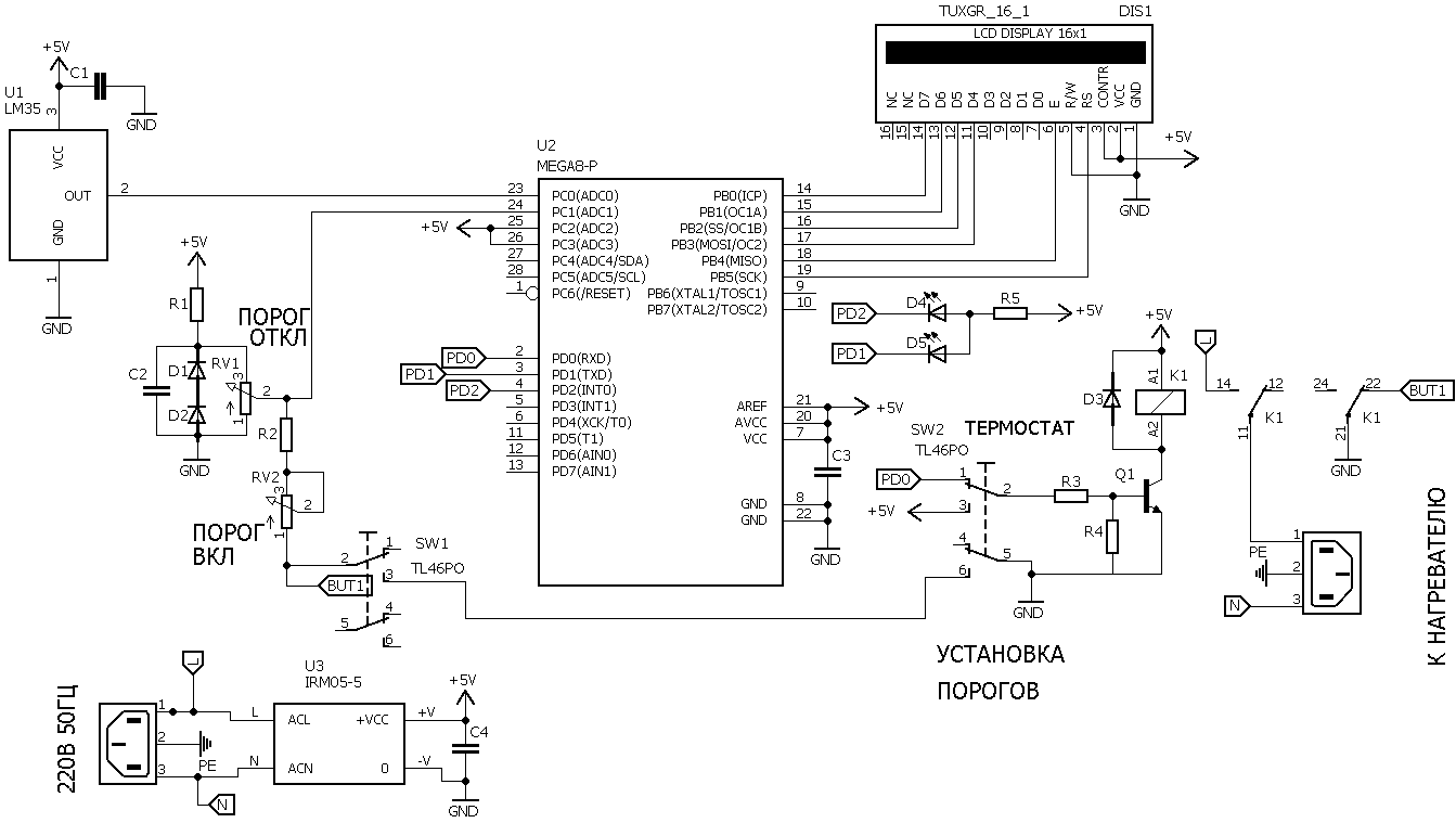 С выхода датчика температуры LM35 напряжение от 0 до 0,5В поступает на вход АЦП PC0 микропроцессора ATMEGA8. На вход АЦП РС1 поступает пороговое напряжение. Этим напряжением определяются пороги включения и выключения нагревателя термостата. Когда выходное напряжение термодатчика LM35 меньше порогового, установленного переменным резистром RV1, на выходе микропроцессора PD0 включена лог.1, транзистор Q1 открыт, реле RL1 и нагреватель включены. Как только выходное напряжение термодатчика достигает порогового, на выходе PD0 включается лог.0 транзистор запирается, реле и нагреватель отключаются, термостат охлаждает.При этом реле своими контактами подключает переменный резистор RV2 Когда выходное напряжения термодатчика понижается до значения установленного этим резистором, на выходе PD0 включается лог.1, транзистор открывается, реле и нагреватель включаются.