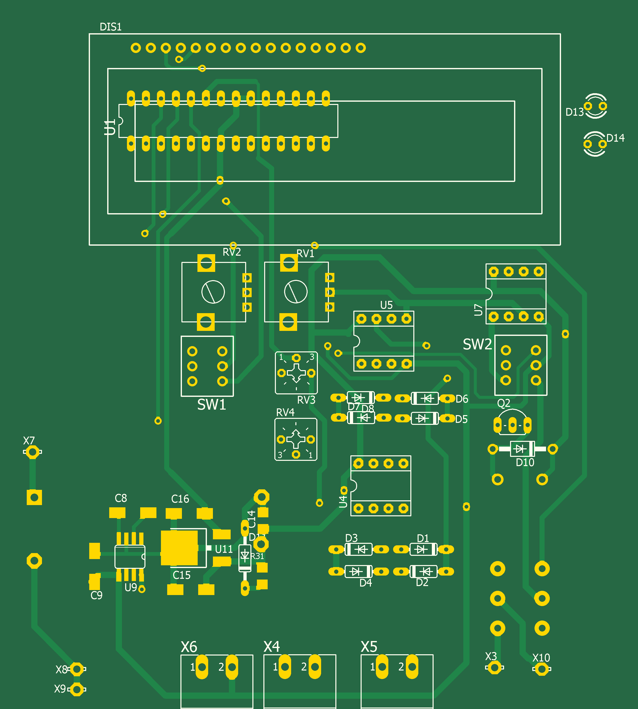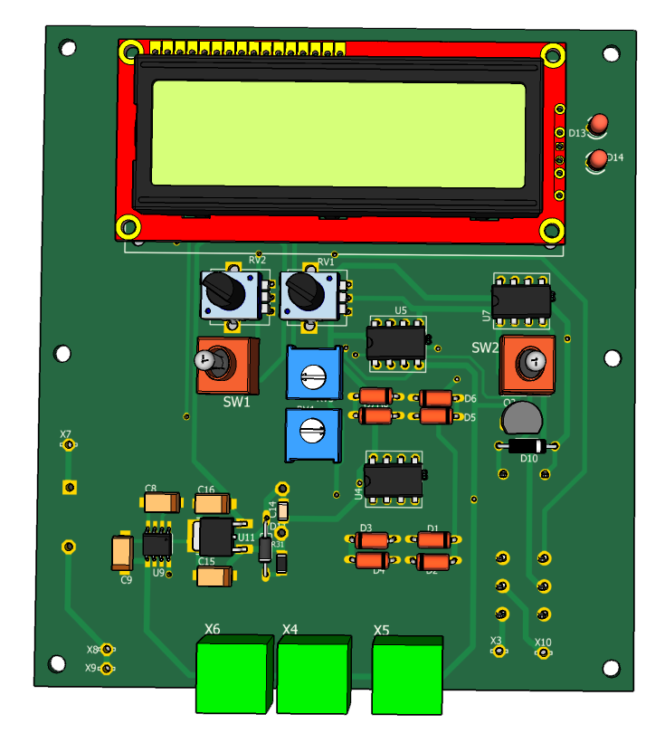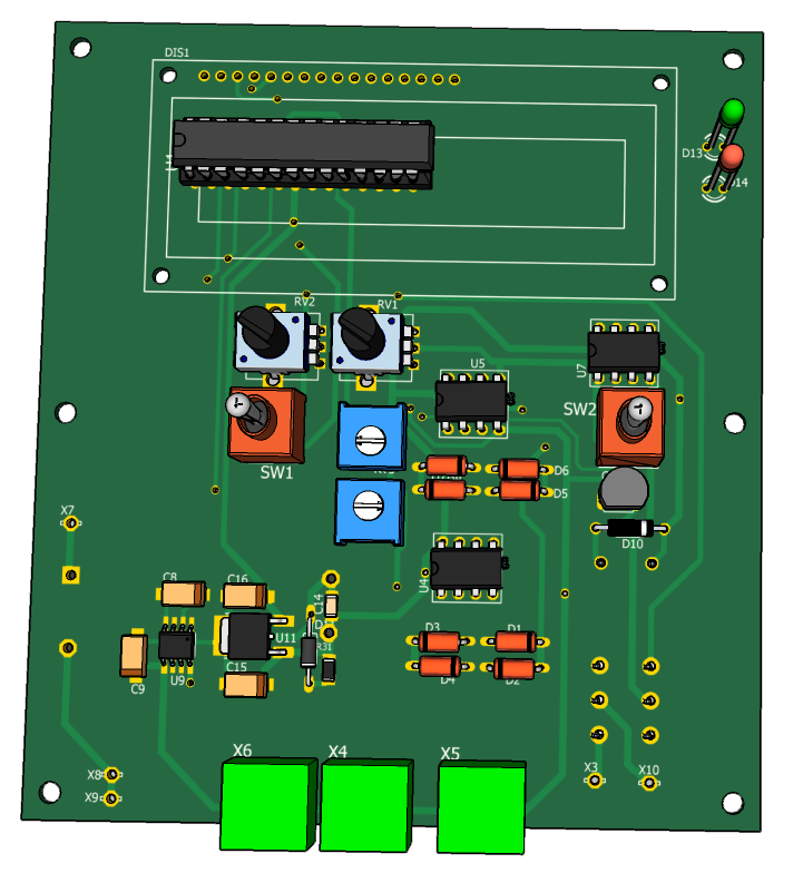 Для установки порога отключения нагревателя переключатель SW2 переключить в нижнее по схеме положение и пернеменным резистором RV1 установить необходимое значение порога выключения по LCD индикатору. Затем установить переключатель SW1 в нижнее по схеме положение и резистором RV2 установить порог включения нагревателя.