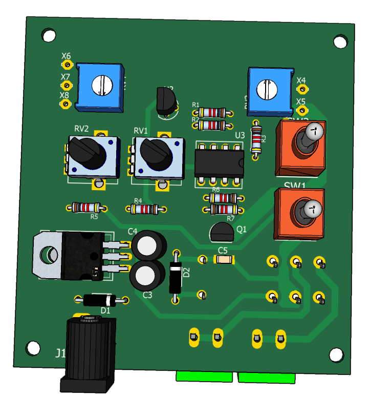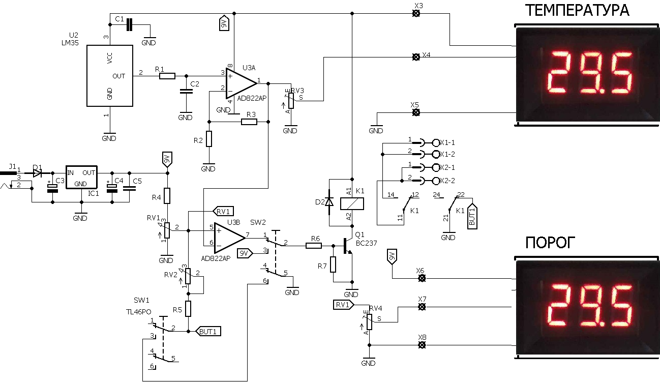 В качестве датчика применяется микросхема U2 LM35. Выходное напряжение этой микросхемы ос 0 до 500мВ в диапазоне температур от 0 до 50°C. Это напряжение усиливается операционным усилителем U3A и измеряется модулем 7-ми сегментного вольтметра, указывающем температуру. Одновременно оно поступает на вход компаратора U3A, где сравнивается с напряжением установленным переменным резистором RV1, Когда оно меньшк установленного напряжения, на выходе компаратора +9В, транзистор Q1 открыт, реле и нагреватель включены. При этом 7-ми сегментный индикатор порога показывает порог отключения нагревателя. Когда температура возрастает до предела, установленного резистором RV1, на выходе компаратора включается 0, транзистор запирается, реле отключает нагреватель.При этом переменный резистор RV1 шунтируется цепью RV2,R5, порог уменьшается до значения, установленного переменным резистором RV2- При этом 7-ми сегментный индикатор порога показывает порог включения нагревателя.