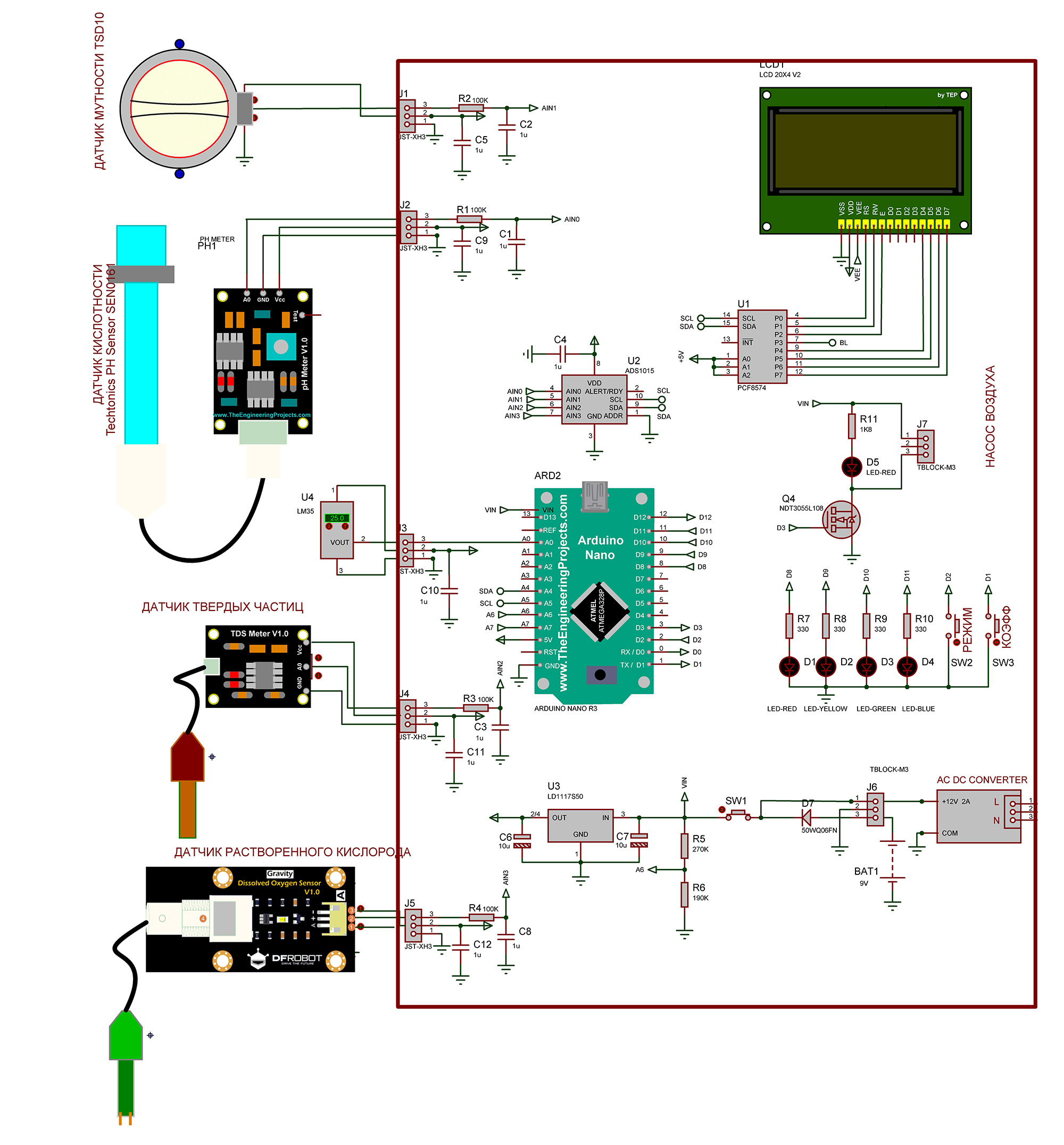 Устройство реализовано на Ардуино Нано. Информация отображается на 4-х строчном 20-ти символьном LCD дисплее, подключенного к Ардуино через I2C порт. Питание от сети 220В или от резервного аккумулятора 9В 6800мА/ч.