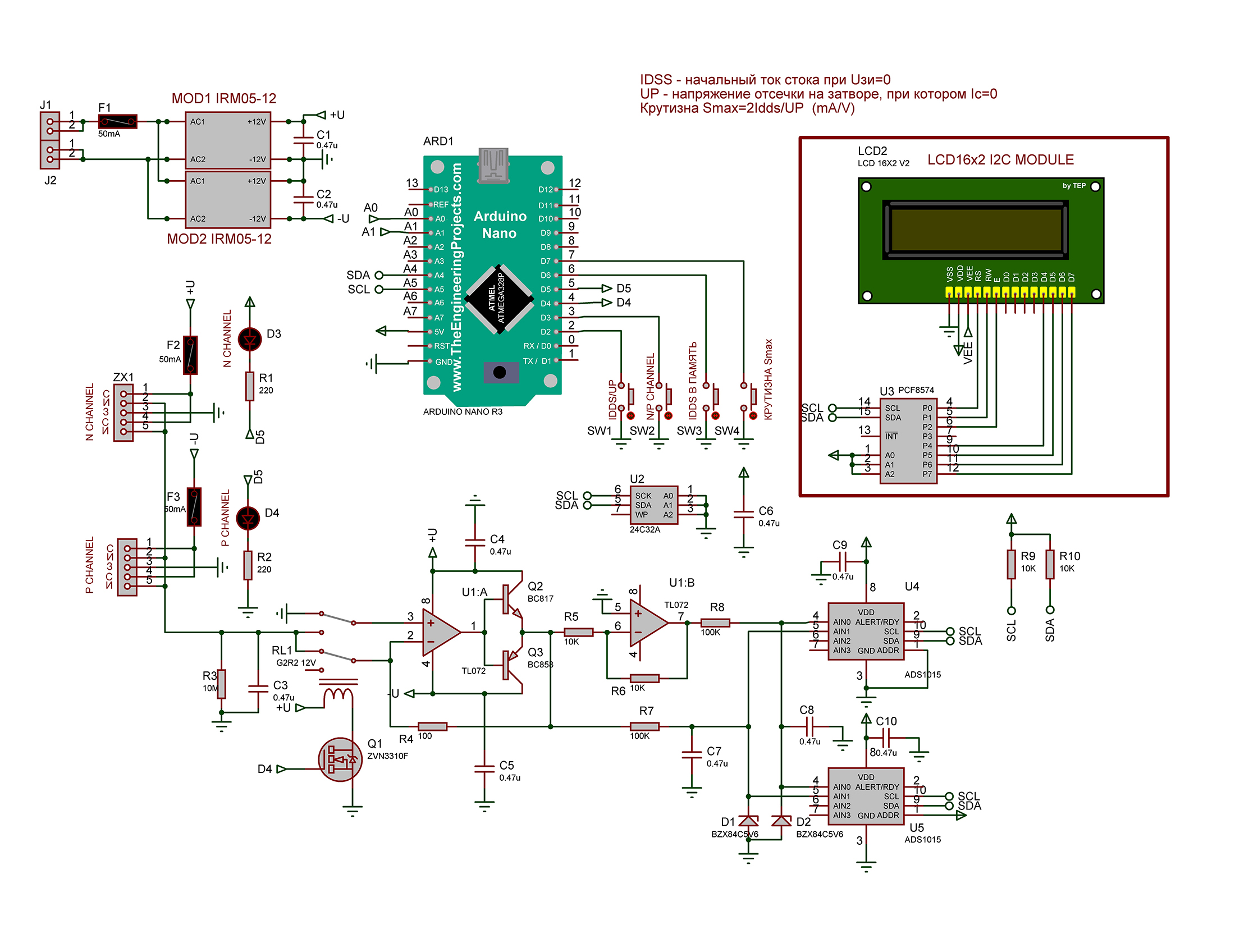 Измерительная часть схемы состоит из инвертирующего усилителя U1B и 12-ти разрядных АЦП U4,U5. С помощью U4 измеряются параметры транзистора с N-каналом, с помощью U5 - транзистора с Р-каналом. Обе микросхемы АЦП подключены к Ардуино по I2C. Стабилитроны D1,D2 подключены для защиты входов АЦП от перегрузки по напряжению. Информация отображается на 2-х строчном 16-ти символьном LCD дисплее подключенном к Ардуино через I2C драйвер U3. Питание устройства от 2-х AC-DC конверторов MOD1,MOD2 входы которых подключены параллельно а выходы последовательно для получения 2-х полярного напряжения +/- 12В. Скетч для Ардуино выполнен в программе FLPROG 8.2.