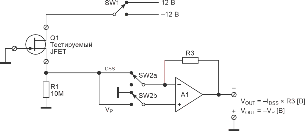 Переключатель SW1 используется для выбора между n-канальными JFET и их менее распространенными собратьями с каналом p-типа. Переключатель SW2 используется для выбора между измерением VP и IDSS. В показанном положении измеряется IDSS. В этом положении A1 сконфигурирован как трансимпедансный усилитель. Когда неинвертирующий вход операционного усилителя подключен к земле, усилитель A1 поддерживает потенциал инвертирующего входа, а значит, и истока, также на уровне земли. Это гарантирует, что измеряется истинное значение IDSS. Затем резистор R3 преобразует ток в напряжение, которое можно измерить на выходе A1. Когда переключатель SW2 переводится в другое положение, усилитель A1 становится простым повторителем напряжения. Напряжение отсечки, которое падает на резисторе R1, затем буферизуется и поступает на выход A1.