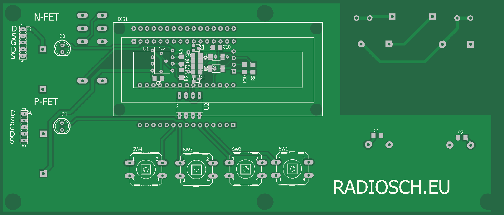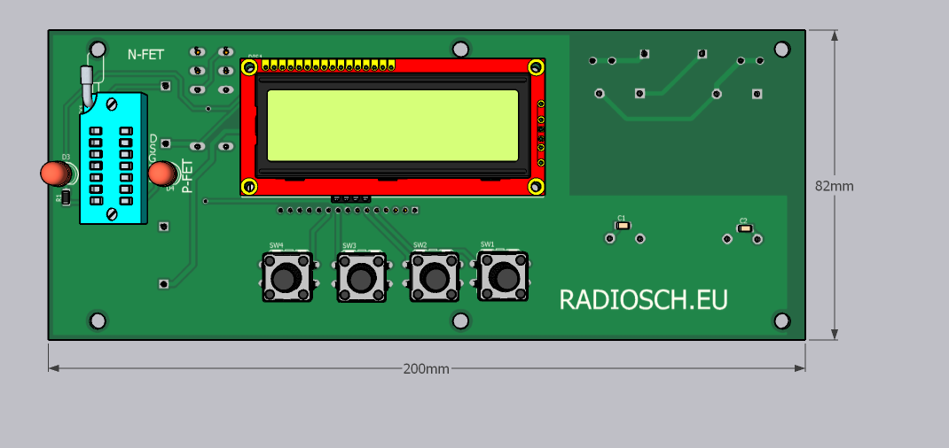 Измеряемый транзистор подключается к панельке для тестирования микросхем DIP14. N- канальный транзистор подключается к контактам 1 - 5, Р- канальный - к контактам 10 - 14. Для измерения начального тока стока до 50мА выход операционного усилителя U1A усилен комплементарной парой на транзисторах Q2,Q3. Полярность измеряемого транзистора переключается кнопкой SW2. При этом включается светодиод D3 или D4. Режим переключения измерения Idss или Up устанавливается переключением реле RL1 с помощью кнопки SW1. Для оценки максимальной крутизны необходимо сначала измерить начальный ток стока Idss, нажатием SW3 сохранить измеренное значение тока в EEPROM U2, затем переключить в режим измерения нгапряжения отсечки Up и нажать SW4.