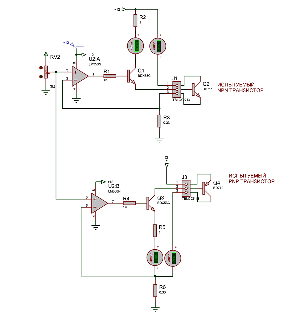 Устройство основано на классических источниках стабильного тока, построенных на операционных усилителях U2 и составных транзисторах Q1, тестируемый npn транзистор Q2 и Q3, тестируемый PNP транзистор Q4. Потенциометром RV2 изменяется ток через коллекторы тестируемых транзисторов. В цепях коллектора Q1 и эмиттера Q3 измеряются токи баз испытуемых транзисторов Q1,Q3 соответственно. Поделив ток коллектора на ток базы можно получить коэффициент усиления по току.