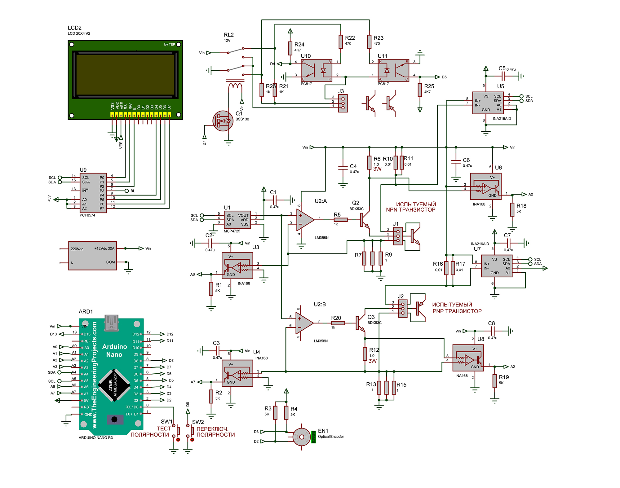 Ток базы PNP транистора измеряется путем измерения падения напряжения на резисторе R12 с помощью датчика U8, выход которого подключен к аналоговому входу А2 Ардуино. Ток коллектора PNP транзистора измеряется с помощью 12-ти разрядного АЦП U7 типа INA219, подключенного к Ардуино по I2C. С помощью датчика U4 измеряется напряжение на эмиттере PNP транзистора. Ардуино рассчитывает напряжение коллектор-эмиттер при установленном токе и вычисляет коэффициент усиления по току h21. Питание от AC-DC конвертора 12В 30А. Информация отображается на 4-х строчном 20-ти символьном LCD дисплее подключенном к Ардуино по I2C. Подробнее на видео. Скетч для Ардуино выполнен в программе FLPROG 8.2