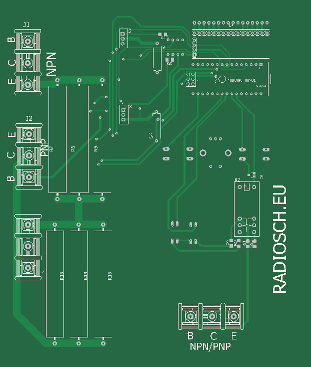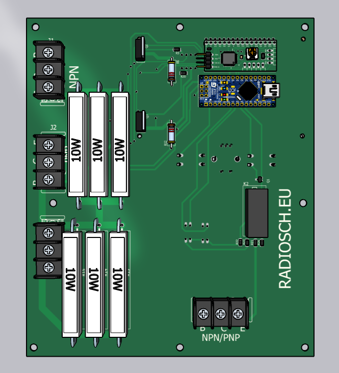 Перед тестированием необходимо определить тип проводимости транзисторов. Для этого подключить ипытуемый транзистор к разъёму J3, нажать на кнопку SW1. Кнопкой SW2 включить индикацию типа проводимости NPN или PNP. Токи базы одновременно 2-х транзисторов устанавливается с помощью энкодера EN1 и ЦАП U1 типа МСР4725. Ток базы NPN транзистора измеряется путем измерения падения напряжения на резисторе R6 с помощью датчика тока U6, выход которого подключен к аналоговому ввходу А0 Ардуино. Ток коллектора NPN транзистора измеряется с помощью 12-ти разрядного АЦП U5 типа INA219, подключенного к Ардуино по I2C. С помощью датчика U3 измеряется напряжение на эмиттере NPN транзистора. Ардуино рассчитывает напряжение коллектор-эмиттер при установленном токе и вычисляет коэффициент усиления по току h21.